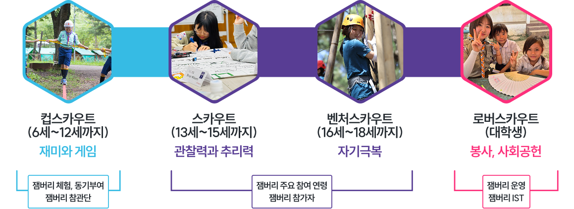스카우트는 UNESCO, WHO, 국제레크리에이션 UNICEF, ECOSOC의 자문기구(Consultative Status)로서 상호 협력적 관계에 있으며, 세계 각국으로부터 청소년 운동의 보편성과 역사성을 인정받고 있습니다. 또한 자신의 능력과 흥미에 따라 기쁨에 도전하는 진보 제도와 협력 정신과 책임감 그리고 리더쉽을 기를 수 있는 반제도 등 다양한 프로그램을 운영하고 있습니다.