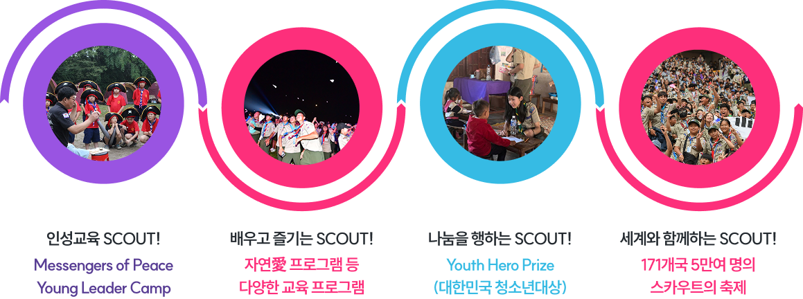 스카우트는 국가와 인종, 계급과 종교를 초월하여 형제애로 뭉친 범세계적 청소년 운동으로, 청소년들이 대자연속에서 단체 생활을 통해 스스로 자신의 잠재 능력을 개발하여, 국가 사회와 세계발전에 이바지할 건전한 청소년을 육성하는데 목표로 활동합니다.